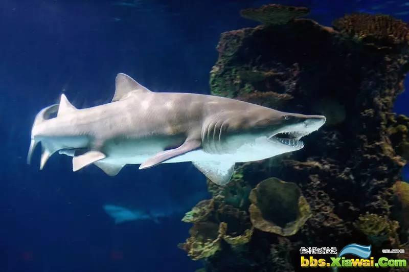 沙虎鲨是锥齿鲨科锥齿鲨属的一种鲨鱼,主要分布于大西洋、印度洋、太平洋等地区,是一种近海海域的大型鲨鱼,体长在3-3.5米之间,体重在95-110公斤之间,沙虎鲨是唯一一种可以将空气储藏在胃部的鲨鱼,主要以硬骨鱼、其他小型鲨鱼、龙虾、鱿鱼等为食。