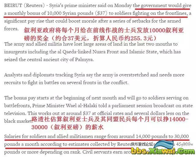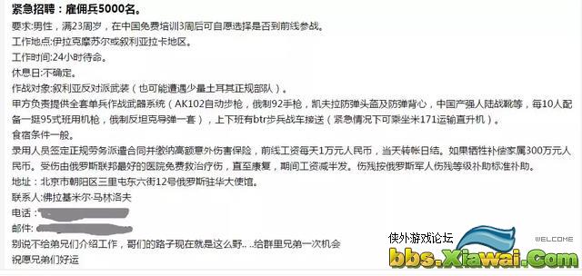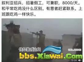 以上内容就是叙利亚招兵暑假工(去叙利亚当雇佣兵一天8000块?都是骗子!实际工资低到令人绝望)的相关内容介绍,喜欢侠外游戏论坛的朋友可以关注我们。