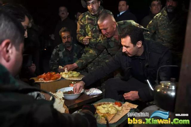 ▲巴沙尔总统在前线和士兵一起就餐