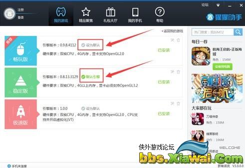 两个引擎安装好之后,就可以往2个引擎上添加游戏了,设置当前默认引擎,安装游戏即可安装到指定的默认引擎上。