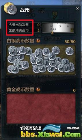 点开这个选项就会出现战币窗口。战币窗口中可以查今天出航次数和出航所需战币。这里所显示的是用白银战币出航的次数和战币数量。